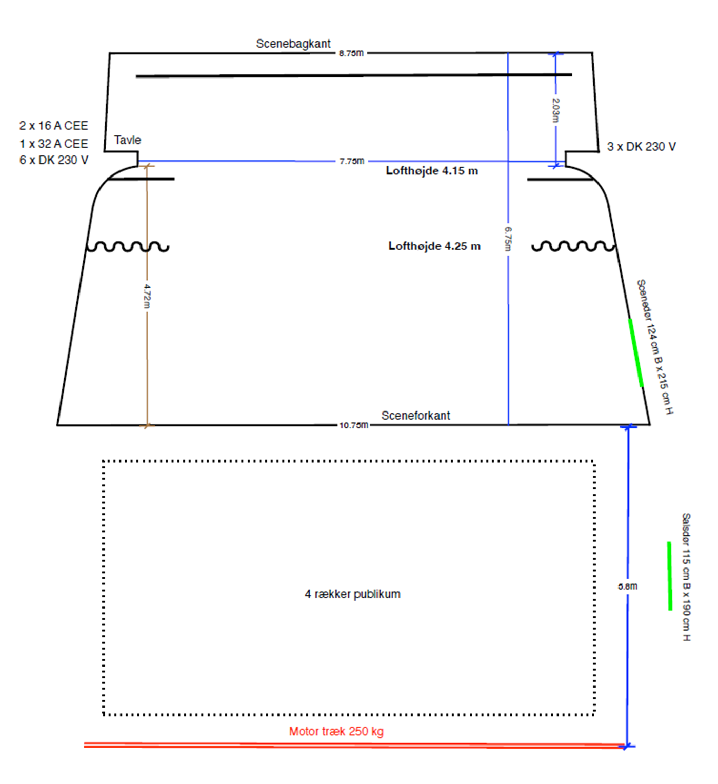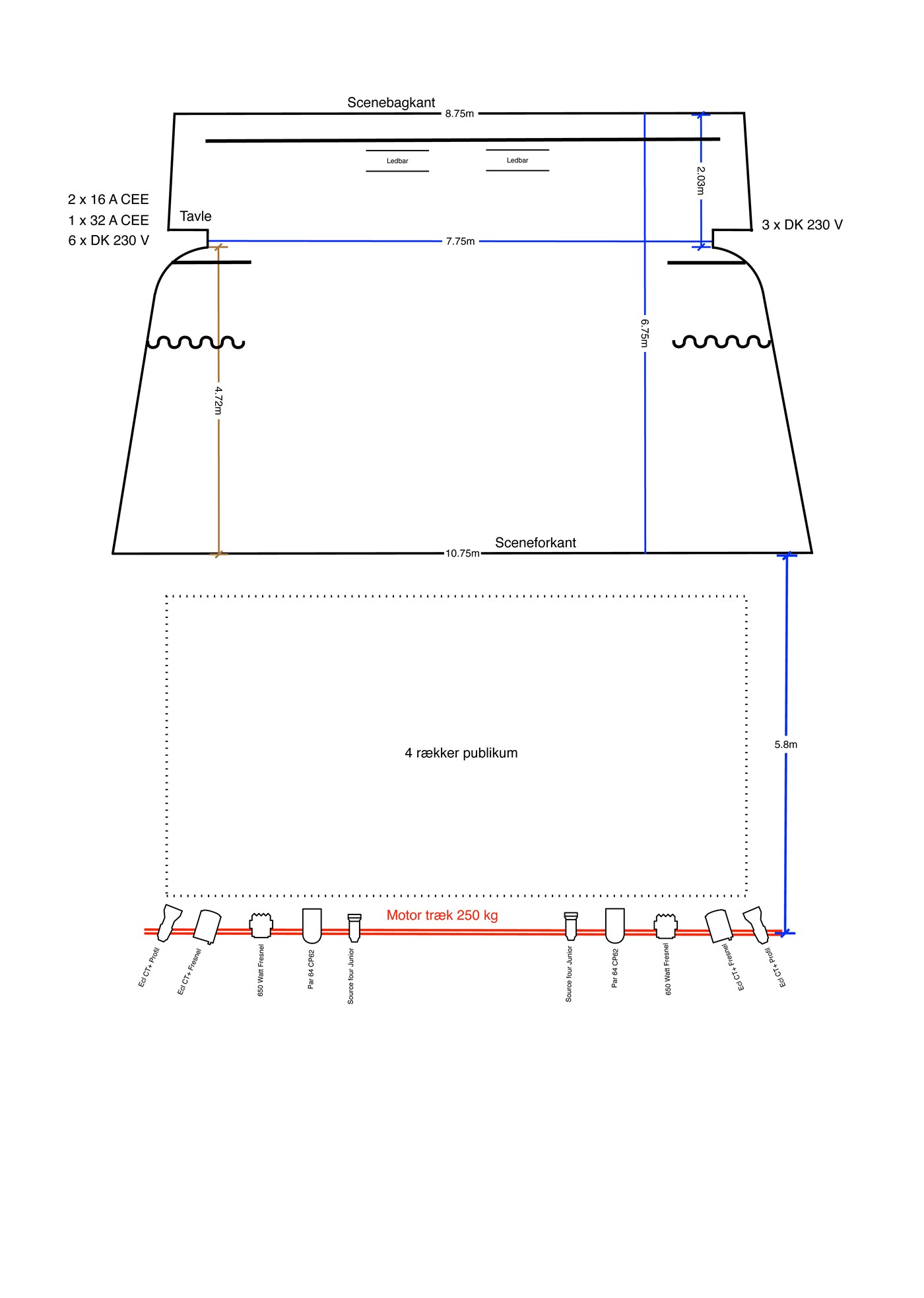Fast monterede lamper på vores front træk i salen, og top lys til vores røde bagtæppe. Se lys plan på
